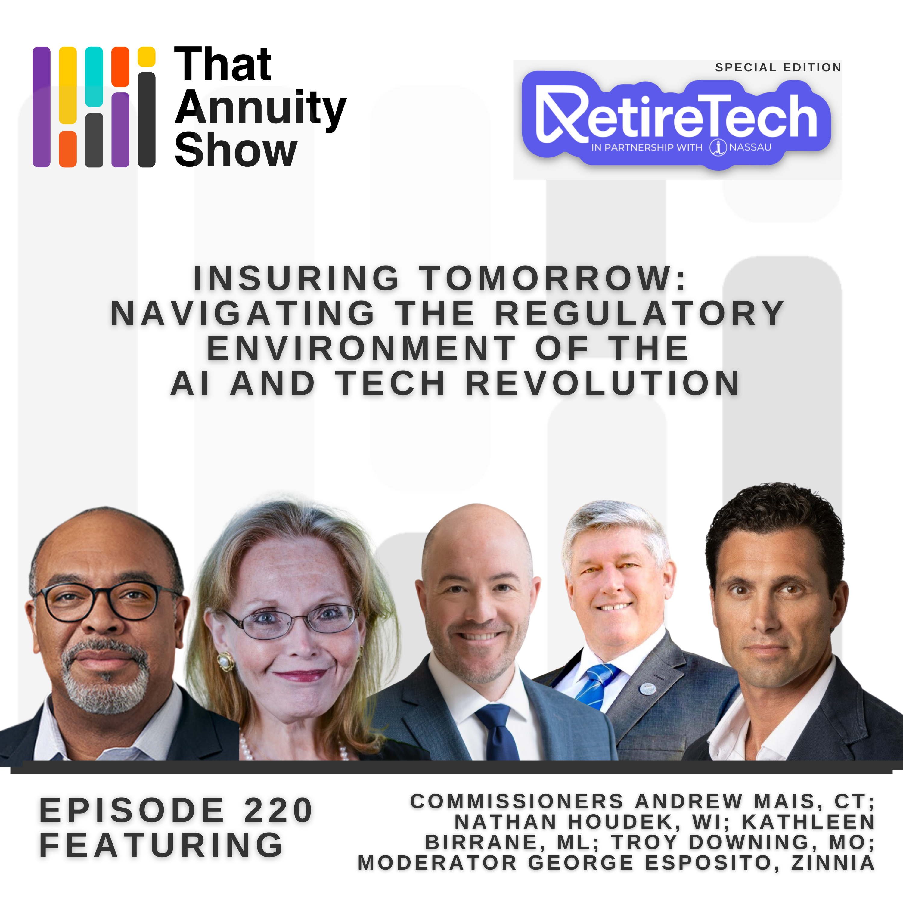 In this episode of That Annuity Show, recorded live at RetiretechTM Vegas, we delve into the dynamic interplay between technology, regulation, and innovation within the insurance industry. Our panelists, including Commissioners Andrew Mais from Connecticut, Nathan Houdek from Wisconsin, Kathleen Birrane from Maryland, and Troy Downing from Montana, along with moderator George Esposito of Zinnia, lead a discussion on the pivotal role of artificial intelligence (AI) in reshaping the landscape of insurance.